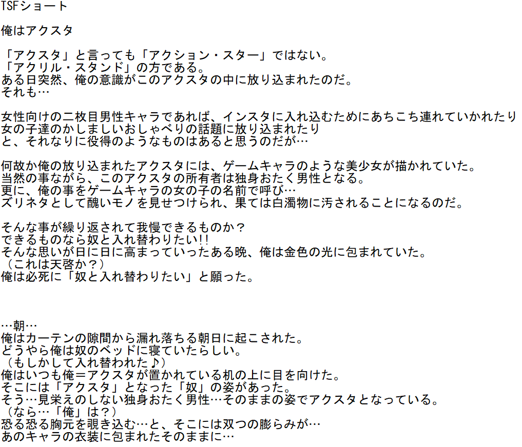 ある日突然、俺の意識がこのアクスタの中に放り込まれたのだ。